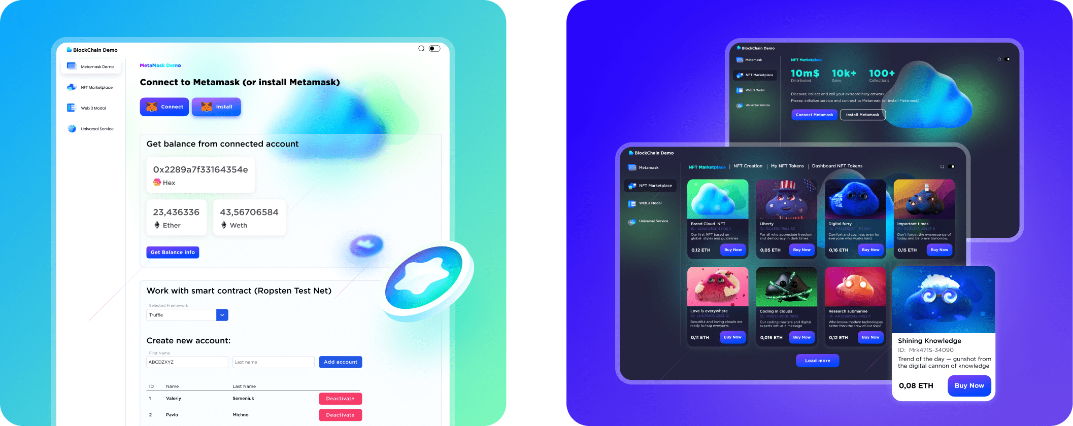At ABCloudz, our employees are constantly exploring the potential for technological innovation and adopting the latest technologies. Blockchain is one of the hottest topics in the tech industry, so our team has created a dynamic and functional marketplace application that leverages the secure Ethereum network. This app is an example of how it’s possible to combine blockchain technology with core features of an e-commerce app to create a highly customizable and secure NFT platform.